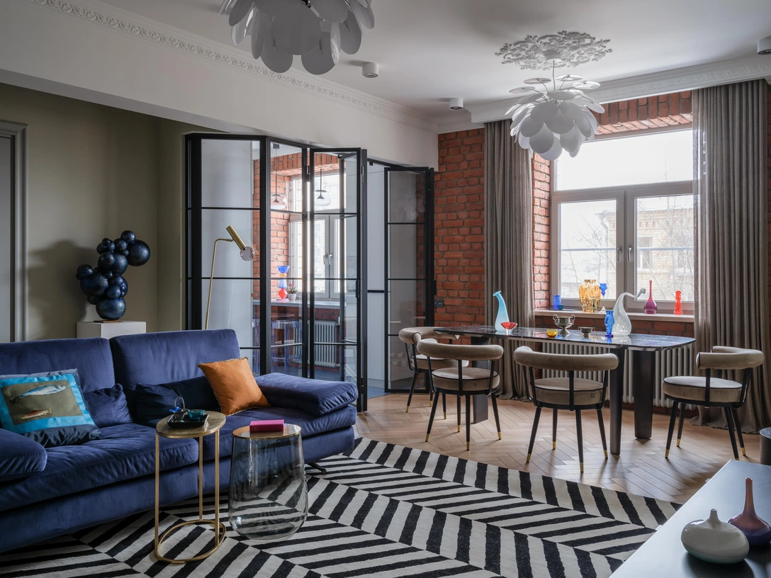 Интерьер наполнен предметами искусства, которые привносят в обстановку легкие ироничные нотки. Шарообразная абстракция Льва Ефимова, расположившаяся на пьедестале в гостиной, для нас символизирует пойманные и собранные воедино моменты и впечатления. Литография «Поцелуй» в прихожей отражает яркие и гармоничные отношениях пары, а скульптура на подоконнике в спальне говорит о течении времени и каждый день напоминает хозяевам, что жизнью нужно наслаждаться сейчас.