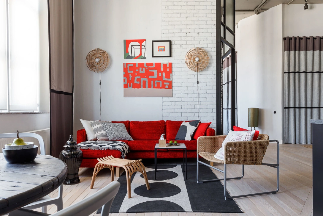 Цветовая гамма: черно-белая гамма с насыщенными красными и синими акцентами