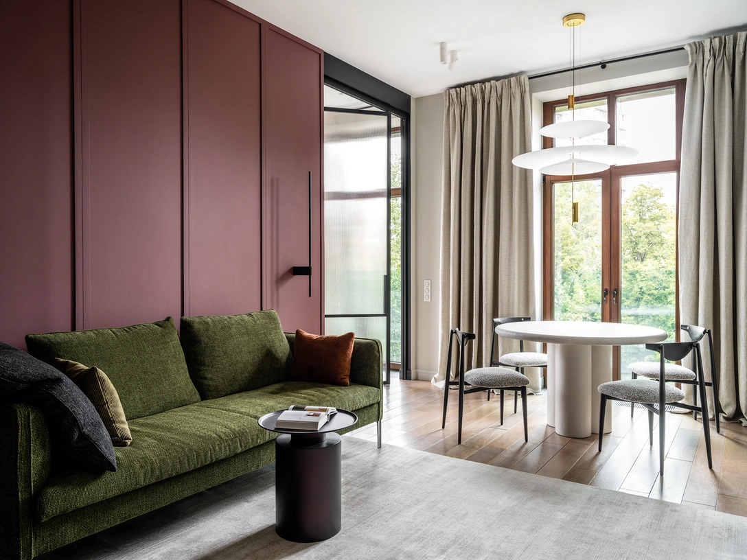 Мягкая зона в гостиной выделяется за счет винного оттенка и настенного декора, который задает вертикальный ритм. Диван цвета хаки прекрасно сочетается с зеленью деревьев, которые видно из окна. Стену напротив дивана мы намерено оставили пустой — она служит экраном для проектора.