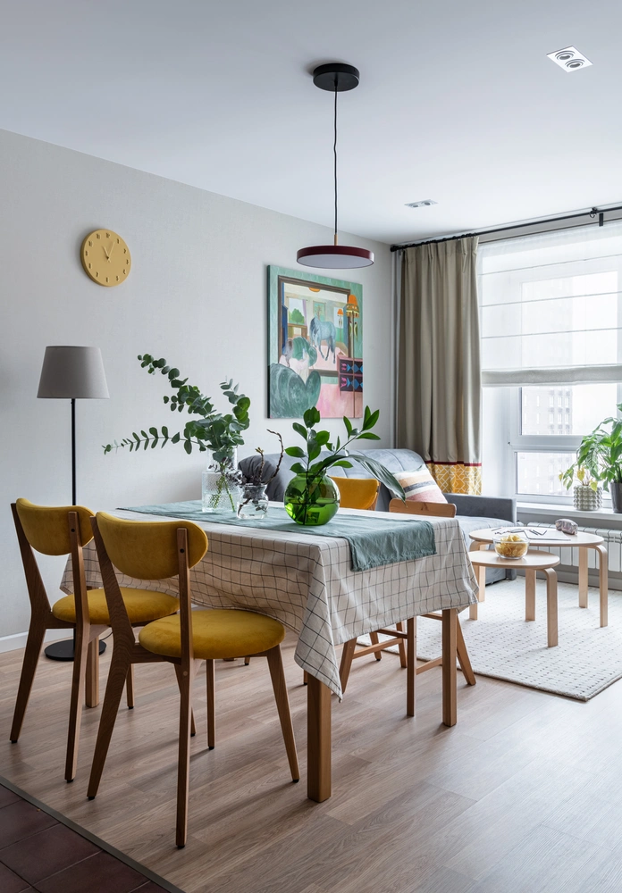 Прихожую украсили обои с геометрическим принтом, который помог отвлечь внимание от г-образной планировки коридора. В небольшой кухне-гостиной дизайнеру удалось разместить удобную рабочую зону, оборудованную всей необходимой техникой, столовую для четырех человек и диван для совместных киновечеров. Нижние шкафы кухни перекликаются с цветом напольной плитки, а верхние выполнены в нежном мятном оттенке. Благодаря этому при всей своей яркости они не привлекают слишком много внимания и не кажутся громоздкими.