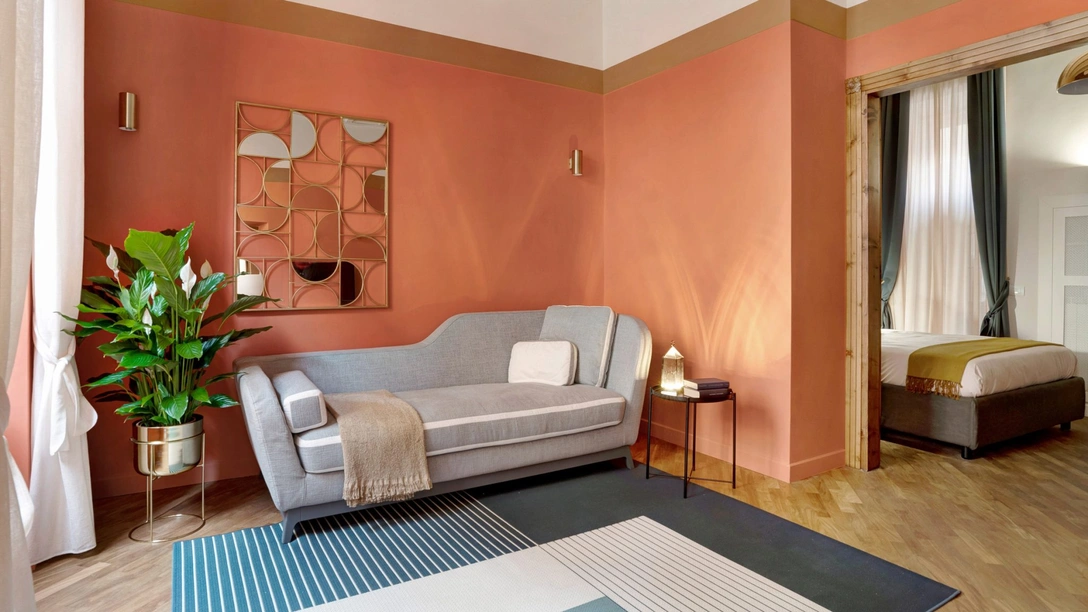 Чтобы исправить ситуацию, миланская студия Venturoni снесла массивные каменные перегородки. В центре квартиры разместилась просторная гостиная с обеденной зоной. Стены выкрашены краской терракотового и песочно-бежевого оттенков, которые, по мнению дизайнеров, ассоциируются с Римом. Кроме того, широкие горизонтальные полосы визуально расширяют пространство.