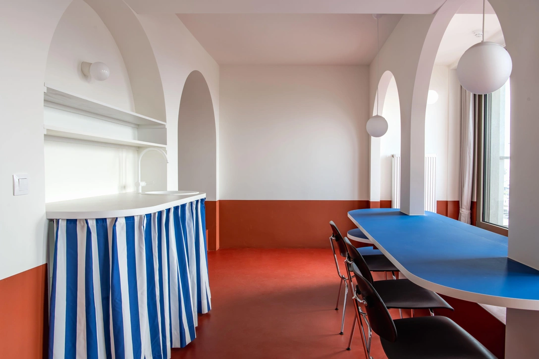 На площади 35 кв.м. предусмотрена небольшая кухня, обеденная зона, которая также служит местом для работы, отдельная ванная и спальня. Весь пол квартиры выкрашен в терракотовый цвет, который «поднимается» на стены и формирует четкую горизонтальную линию, очерчивающую периметр пространства. Еще одним ярким акцентом стал длинный ярко-синий стол. Его оттенок рифмуется с принтом на шторе, скрывающей содержимое кухонного шкафа. Ритм интерьеру задают арки, которые обрамляют окна, входную зону и микро-спальню, спрятанную в нише.