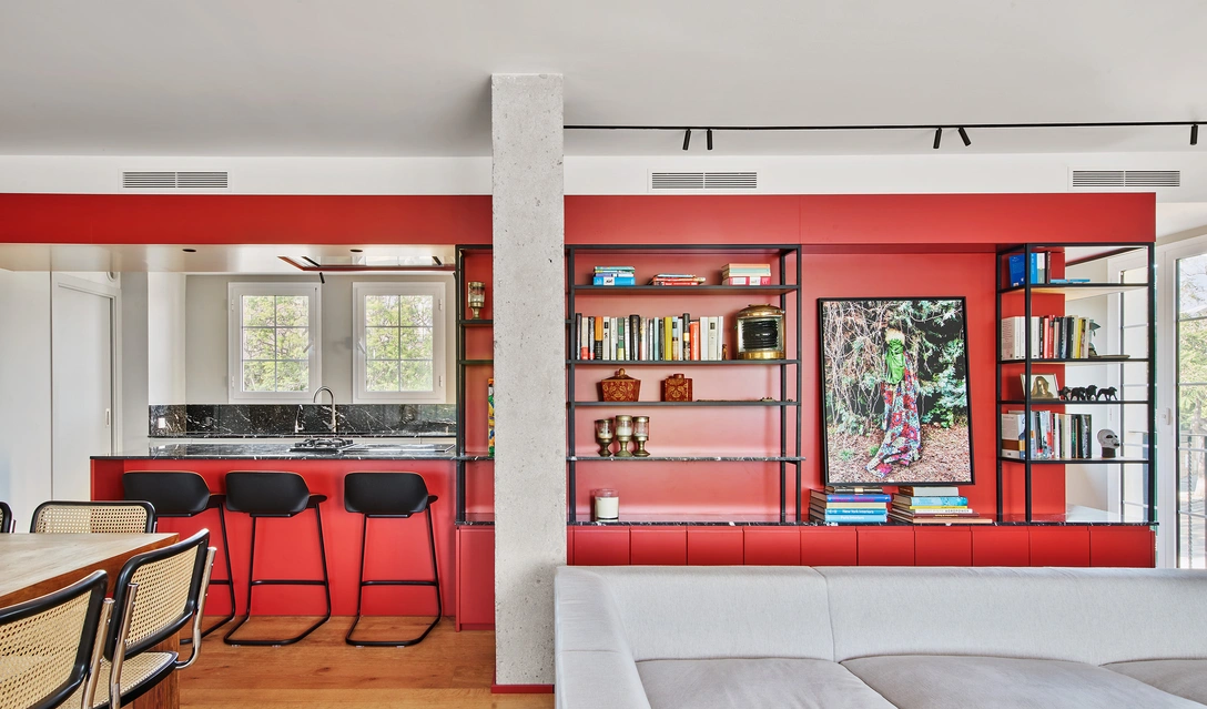 Дизайнерам досталась квартира с классической планировкой: все комнаты были соединены холлами и коридорами. Первым делом команда избавилась от лишних перегородок и объединила кухню, гостиную и столовую в единое светлое пространство. По всей длине помещения проходит мебельная конструкция ярко-красного цвета: стеллаж в гостиной, с противоположной стороны которого разместился гардероб для одежды, который плавно перетекает в кухонный остров в зоне кухни.