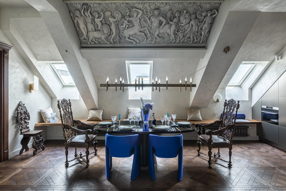«Мы рады, что эта квартира дождалась именно нас, — подхватывает рассказ Николай. — Все непрофессионалы, кто приходил сюда, просто не понимали, что делать со всей этой сложной геометрией скошенных стен, балок и мансардных окон. Но мы сразу разглядели невероятный потенциал пространства!»