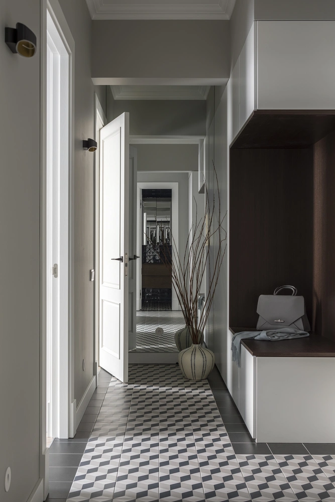 «В квартире общей площадью 53 квадратных метра была типичная для позднего периода сталинских интерьеров планировка: длинный коридор и выходящие из него двери комнат, кухни, санузла и ванной, — продолжает Карина Задвина. — К моменту постройки дома широкие холлы и высоченные потолки уже не делали. И все же мы поставили перед собой цель оставить в интерьере стилистические элементы советского интерьера: белые двери, сдержанную лепнину и напольную плитку с геометрическим узором. Точнее, восстановить их, ибо прежние хозяева оставили после себя ремонт в стиле „барококозолотойампир“. При этом мы стремились не уходить совсем в 50-е годы, а подчинить интерьер современному образу жизни владельцев».