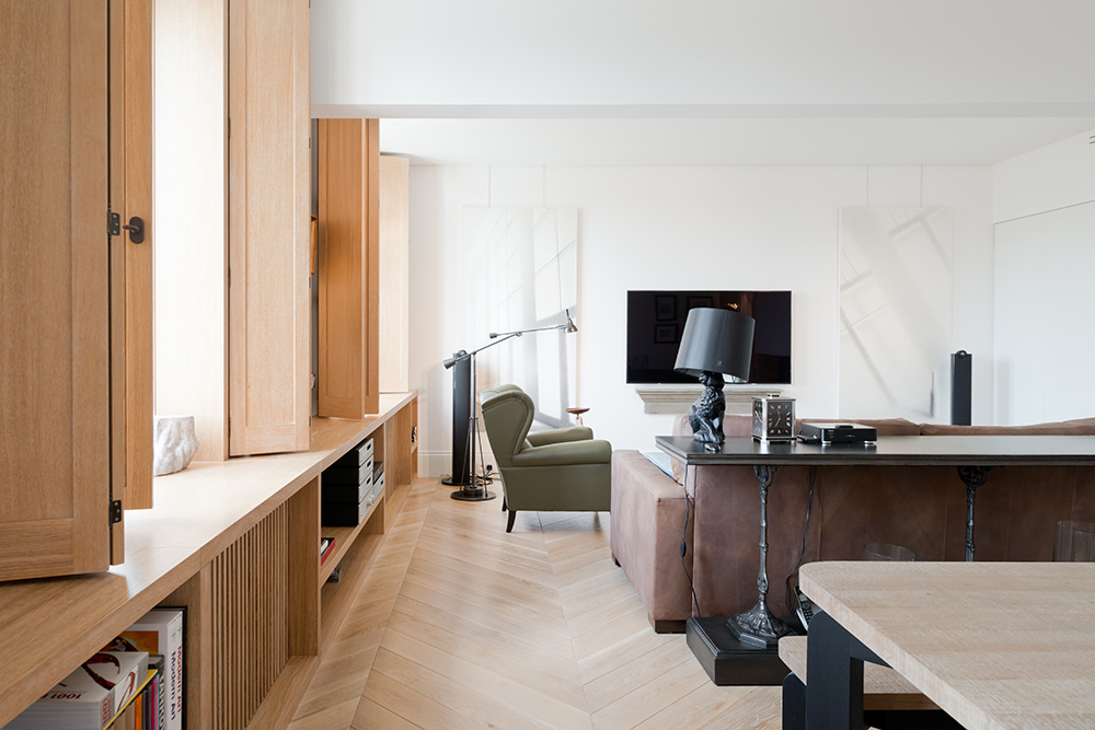 «Для создания впечатления свободного и не загроможденного пространства, все шкафы сделаны встроенными. За панелями в гостиной и прихожей скрываются вместительные системы хранения. Пол во всей квартире, за исключением ванных комнат, выложен дубовым паркетом с крупными плашками и традиционным рисунком кладки „французская елка“. Такое решение позволило немного смягчить аскетичное решение стен и потолка в квартире».