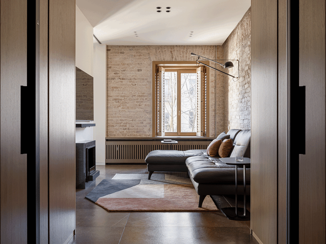 «Заказчик хотел оставить старый кирпич открытым. Чтобы он не „убил“ интерьер своим доминирующим рыжим цветом, мы решили покрыть кладку известковой штукатуркой. Сначала мы растерли состав вместе с кирпичной пылью, а сверху закрепили грунтовкой, чтобы покрытие не осыпалось. Так нам удалось сохранить „живость“ кирпича и подчеркнуть его текстуру».