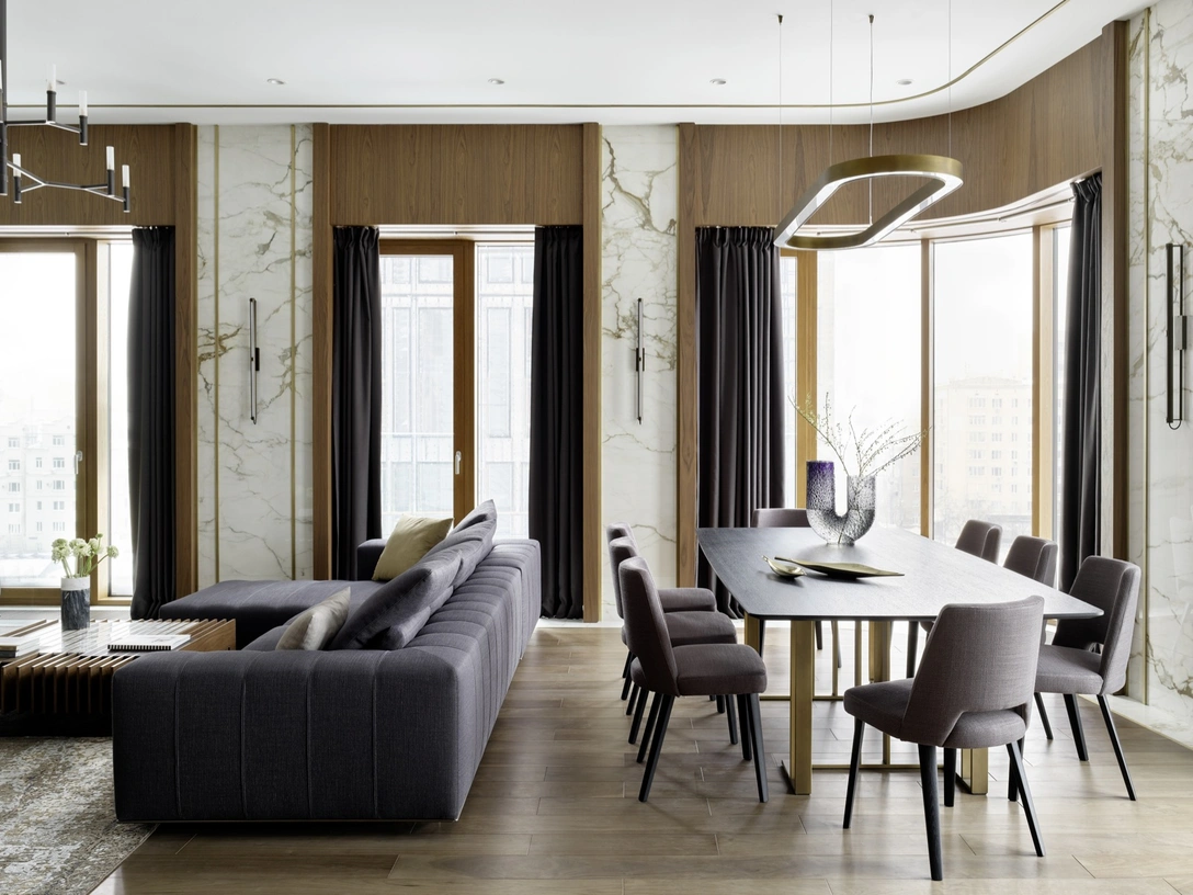 Сдержанный, спокойный, элегантный, респектабельный — все эти эпитеты точно определяют настроение интерьера, созданного для молодой пары дизайнером Наилей Гумировой. Квартира площадью 150 кв. метров расположилась в самом центре Москвы, и одним из ее главных преимуществ стали виды на город из панорамных окон. В планировку, предложенную застройщиком, решили не вносить серьезных изменений, дизайнер лишь слегка скорректировала основные объемы. Все пространство квартиры разделили на две зоны — общественную с гостиной-столовой и кухней и приватную со спальнями, гардеробными и ванными комнатами.