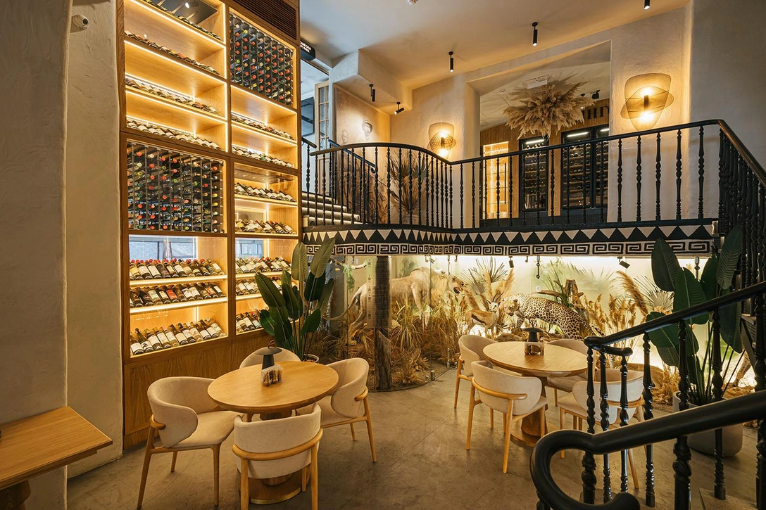 Сухоцветы как напоминание о засушливой почве и коричнево-бурой земле и живая зелень вместе подчеркивают разнообразие природы и климата второго по величине континента мира. Чтобы гости могли проникнуться атмосферой далекого материка, в зале играют африканские мелодии, а шеф-повар во время гастрономического перфоманса специально создает для гостей какое-нибудь удивительное блюдо, не входящее в меню.