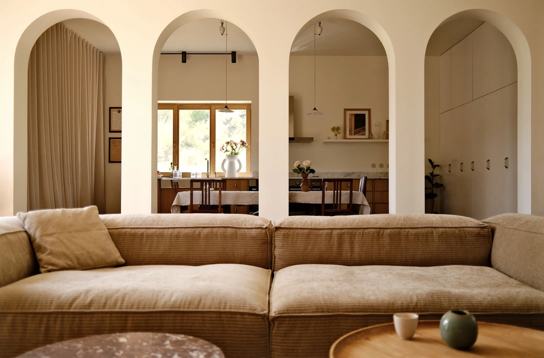 В доме четыре гостевых комнаты с собственной ванной комнатой и просторная кухня-гостиная, где можно собираться большими компаниями. Интерьер оформлен в мягких, пастельных тонах. Бежевые и песочные оттенки гармонично сочетаются с текстурой дерева разных пород, перламутровой плиткой и тканями кофейного цвета. А благодаря авторской росписи на стенах кухни, обоям и шторам с ярким растительным принтом в спальнях и изумрудной плитке в ванной интерьер не выглядит скучным и однообразным.