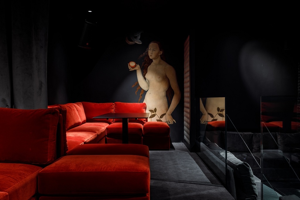 «Что касается концепции интерьера, самое важное было придумать необычный сценарий, — рассказывает Надежда. — В прошлом году на Миланском мебельном салоне я была загипнотизирована одной инсталляцией из LED панелей, изображающей пламя костра. Я застыла в лучах этого пламени и ясно поняла, что вот она отличная тема для ночного заведения: жарко, эффектно, сексуально! Далее возникли образы, в интерьере появились яркий огненно-красный бархат, зеленый змей-искуситель, райские яблочки, тема изгнания из Эдема».
