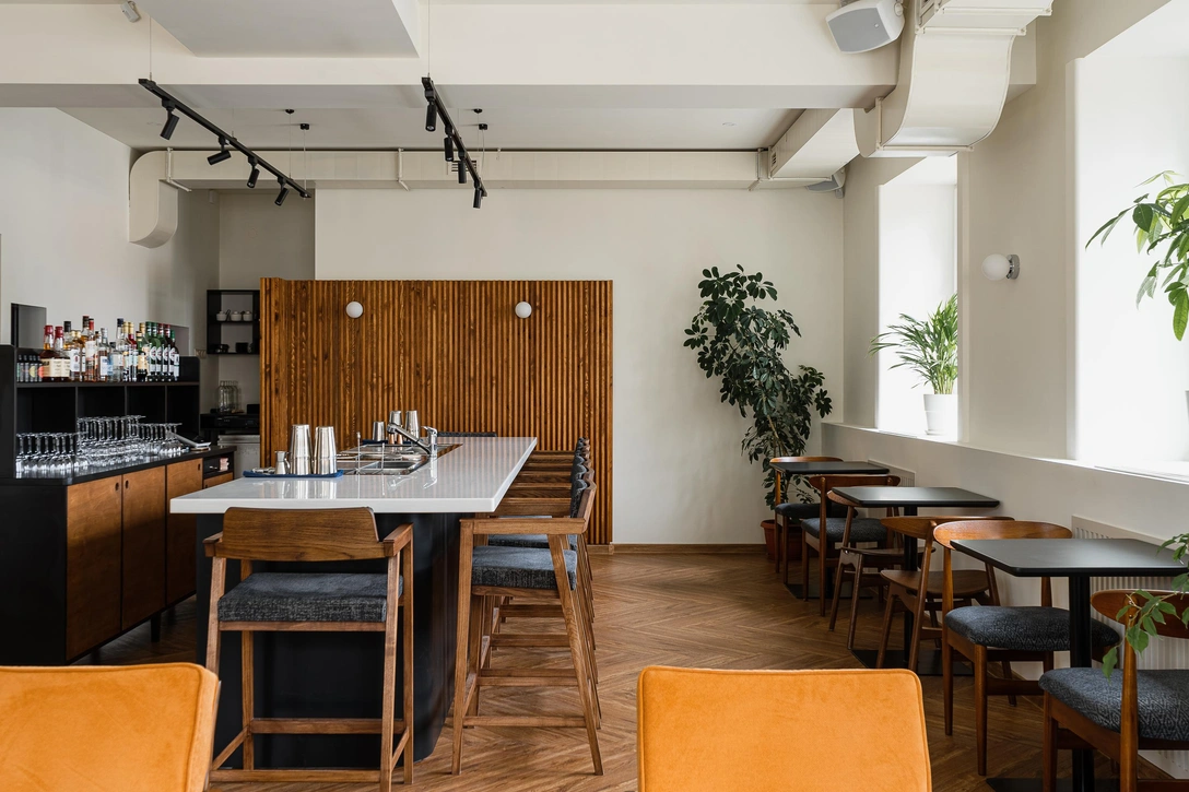 О СТИЛЕ И ИДЕЕ: Заказчики — Петр и Дмитрий — четко сформулировали задачу и точно представляли, что хотят получить в итоге. Обязательным условием было создание светлого интерьера, что не совсем характерно для бара. Это очень интересная задача. Предпочтение отдавалось стилю mid-century, эпохе модернизма и Баухауса с их простотой и чистотой линий, функциональностью, качественными материалами, естественным освещением и удобной мебелью и, конечно, честностью к себе. Ничего лишнего.