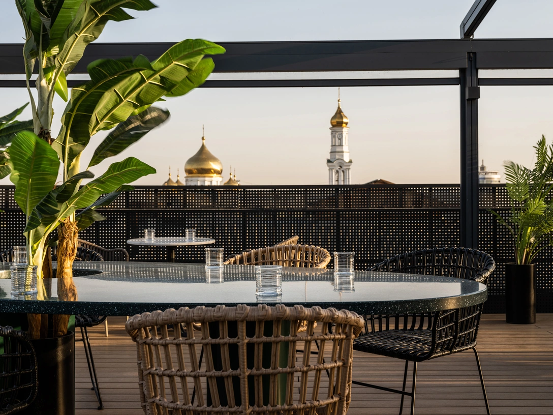 Бар находится на крыше отеля в Ростове-на-Дону и имеет общую площадь 350 кв. м. Перед дизайнерами бюро ArchBlack стояла задача создать комфортное открытое пространство с легкой, южной атмосферой, располагающей к отдыху. Сложность состояла в том, что работы над террасой начались уже после открытия отеля и не должны были мешать работе гостиницы.