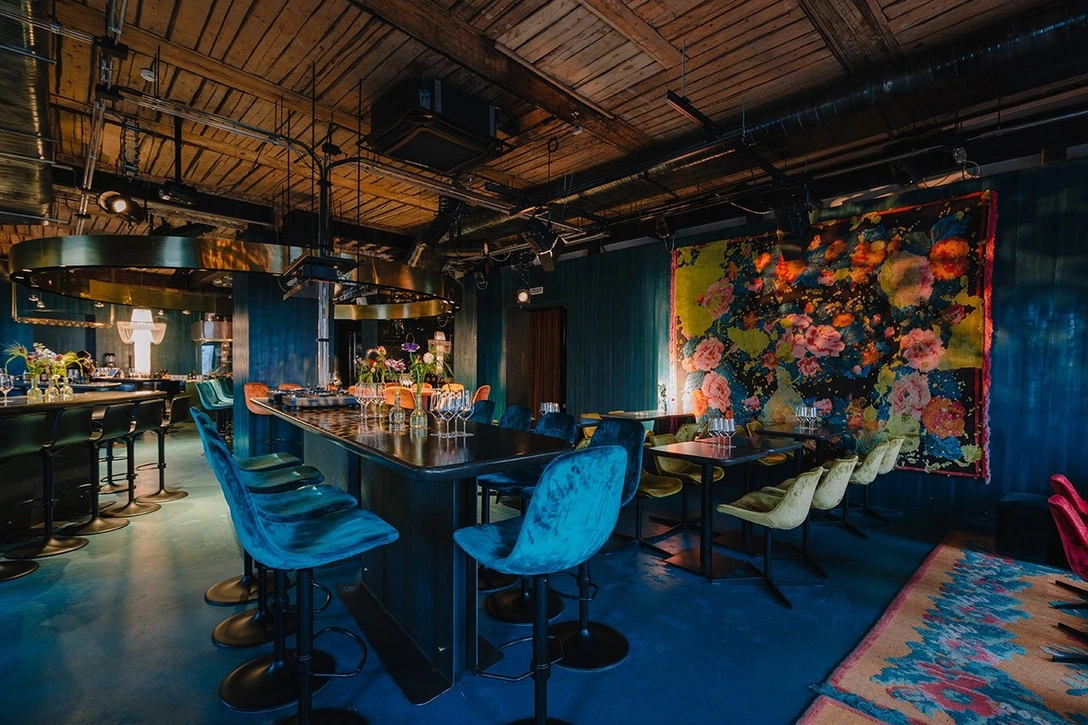 При входе в Big Wine Freaks гости оказываются охвачены энергией контрастных текстур. Решетчатые потолки из необработанной древесины, голые металлические профили, облицованные кирпичные стены, крашеные синие панели обеспечивают безупречный мрачный фон для более роскошных текстур и буйного цвета бархатных стульев и удлиненных угловых диванов Blå Station.