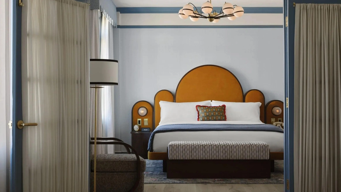 Арочные мотивы повторяются по всему зданию, начиная со яркой стойки администратора во входном холле до штор и эффектных изголовий кроватей в номерах. В вестибюле высокие потолки подчеркнули люстрами в стиле ар-деко и восстановили оригинальную лепнину, а пол на первом этаже украшает геометрический орнамент, напоминающий узоры 1930-х годов.