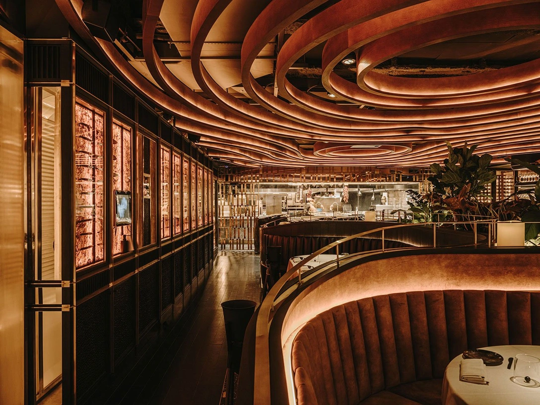 Пройдя через небольшой вестибюль, гости оказываются в тускло освещенном, «многослойном» пространстве, в котором преобладают оттенки черного, вдохновленные якисуги — традиционным японским методом обработки древесины с помощью обугливания. Потолок украшен лабиринтом панелей из мореного ясеня. Его изгибы перекликаются с формой скульптурных банкеток из черной и коричневой кожи. Выполненные на заказ кресла в янтарных тонах на фоне черного гранитного пола, чередующегося с мрамором Nero Marquina, напоминают тлеющие угольки.