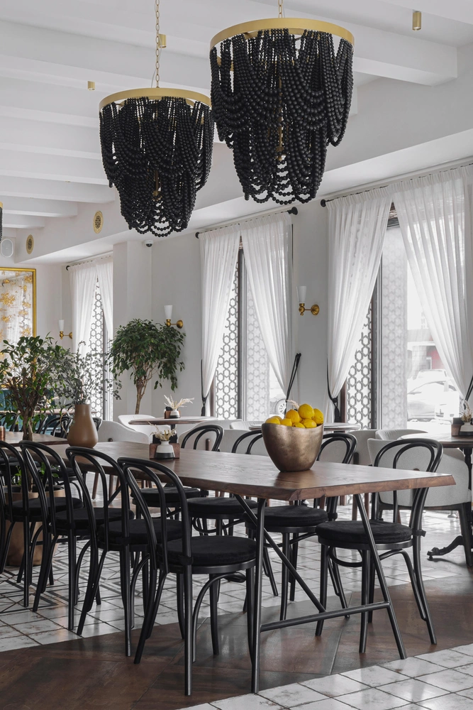 «Мы старались наполнить пространство, но не перегрузить его. Основной зал сделали со светлыми стенами и потолком, оконные проемы декорировали деревянной резьбой, такие же элементы использованы в дверных проемах. Акцентные каскадные люстры из дерева и латуни, барная стойка из арт-бетона с орнаментом, легкий лен с шелковыми кистями и бахромой — эти детали создают атмосферу с легким восточным оттенком», — отмечают авторы проекта.