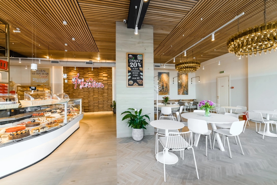 Мы всегда занимаемся оформлением «Брусник» совместно с мужем, Павлом Мокрушиным: расположение витрин, выбор мебели, отделочных материалов — все это всегда остается за нами. Не стал исключением и этот проект. В новом кафе-кондитерской на Садовой-Триумфальной нам удалось создать целостное и гармоничное пространство, где много света и «воздуха».