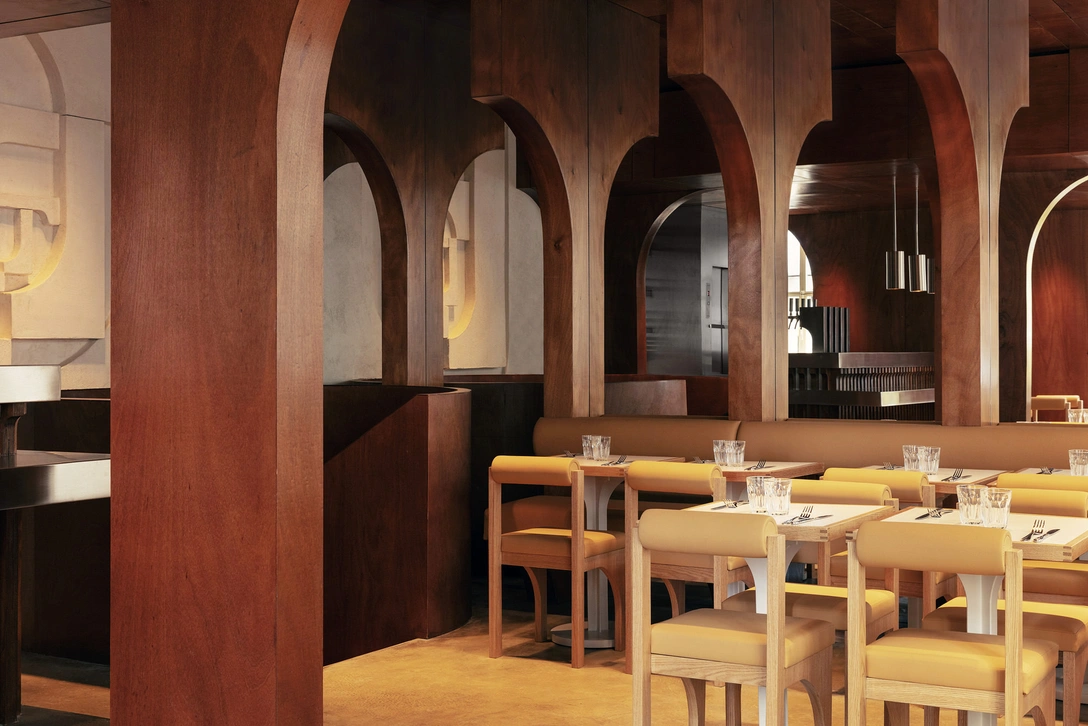 Основным мотивом в интерьере стали арки, форма которых вдохновлена обликом бруталистского здания библиотеки в Бельгии, построенного по проекту Андре Жакмена (André Jacqmain). Мотив повторяется в виде высоких арок, выполненных из темного дерева, форме ножек стульев и оснований барных табуретов. Между тем своды и стены глубокого красно-коричневого контрастируют с кожаными банкетками цвета слоновой кости, светлой деревянной мебелью, дополненной желтыми подушками, и блеском стальных светильников, висящих над барной стойкой.