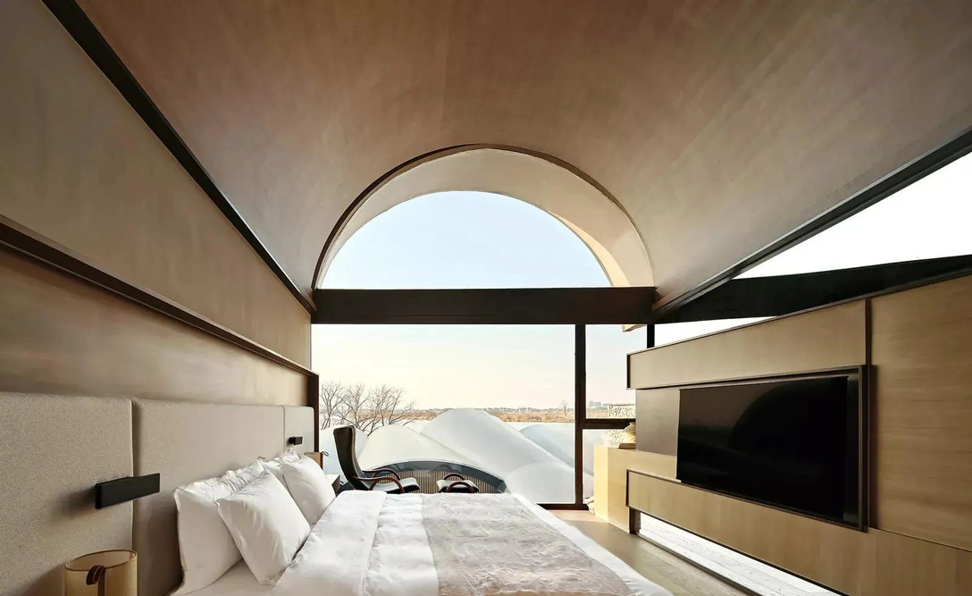 Когда гость наконец добирается до своего номера, граница между внешним и внутренним окончательно перестает существовать. Из номеров, окна которых выходят на берег реки, открывается панорамный вид на набережную. В комнатах второго этажа взгляд притягивает игра света, проникающего сквозь спроектированные архитекторами щели в сводчатом потолке.