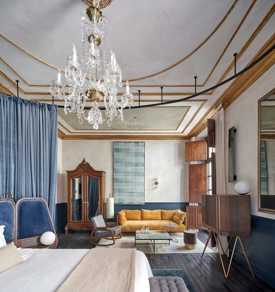 Работая над проектом, дизайнеры старались максимально сохранить романтическую и слегка ностальгическую атмсоферу старого дома, но при этом отказались от исторической реконструкции интерьеров и стилизации их под старину. Напротив, они намеренно наполнили их элементами разных эпох и стилей, создав гармоничное пространство, в котором старое соседствует с новым, а исторические архитектурные детали с современным дизайном.