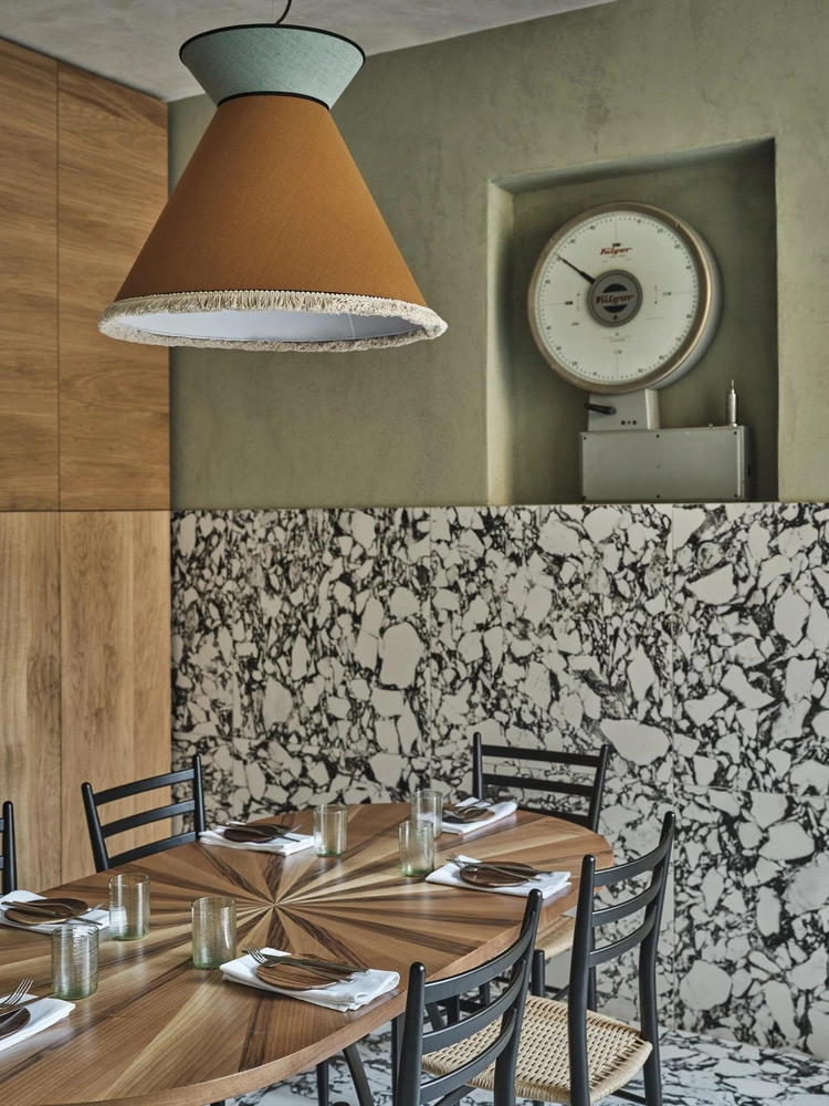 Камерные интерьеры ресторана дизайнер декорировала теплыми естественными оттенками, активными узорами (например, в контрастных линиях мраморных прожилок), элегатной мебелью и сделанными на заказ предметами. И создала пространство, полное противоречий и такое же эклектичное, как и сама Серена.