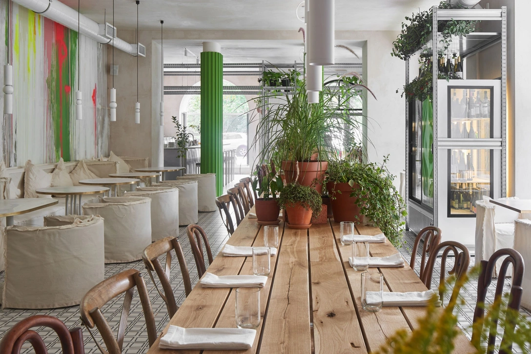 В обновленном интерьере дизайнеры стремились передать умиротворяющую атмосферу загородной жизни. Стены покрыли грубой штукатуркой и покрасили в серый цвет, создав ощущение незавершенности. Большую часть пространства занимают конструкции из металлических профилей, на которых расставлены горшки с растениям: по замыслу авторов проекта, они должны напоминать теплицу. А свисающие практически с потолка кашпо с ампельными растениями и вьюны с крупными листьями превращают помещение ресторана в настоящий сад. Зеленую тему поддерживают также скульптурные колонны, окрашенные в оттенки свежей зелени, которые разделяют зал.