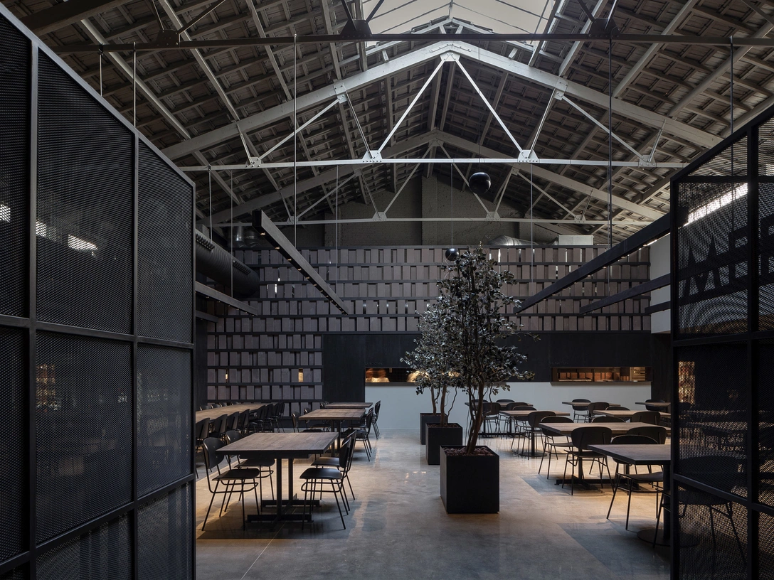 Просторный лофт расположился в самом сердце Валенсии, в районе Старого города. Раньше он служил ангаром для самолетов, но недавно превратился в необычный ресторан с легкой руки дизайнеров из барселонского бюро Francesc Rifé Studio. Дизайн входной зоны сразу привлекает любопытные взгляды прохожих: лаконичная вывеска украшает гигантскую дверь из сосновой древесины, выкрашенный в радикально черный цвет.