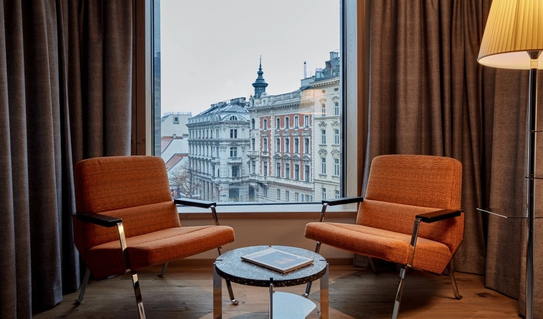 Над номерами и сьютами работала студия Wehdorn Architects, которая разделила пространство комнаты на три зоны. Прихожая представляет собой стильное небольшое помещение с невысокими потолками и деревянной отделкой. Центральное место в спальной зоне отведено роскошной кровати king-size, изголовье которой украшено стеновыми панелями с рисунками художницы Эстер Стокер (Esther Stoker). И, наконец, заканчивается комната небольшой зоной отдыха с мягкими креслами и журнальным столиком у окна, из которого открываются виды на Собор Святого Стефана (St Stephen’s Cathedral) и другие достопримечательности Вены.