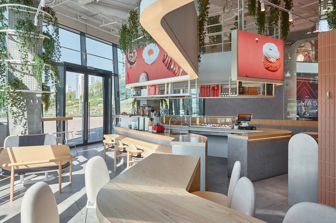 Главной визуальной деталью кофейни стал большой LED-экран, который, как изогнутая лента, повторяет форму барной стойки. Длина экрана — почти тринадцать метров, а высота полтора метра, на нем можно транслировать любое видео — от десертов и видов кофе из меню до инсталляций местных моушн-художников.