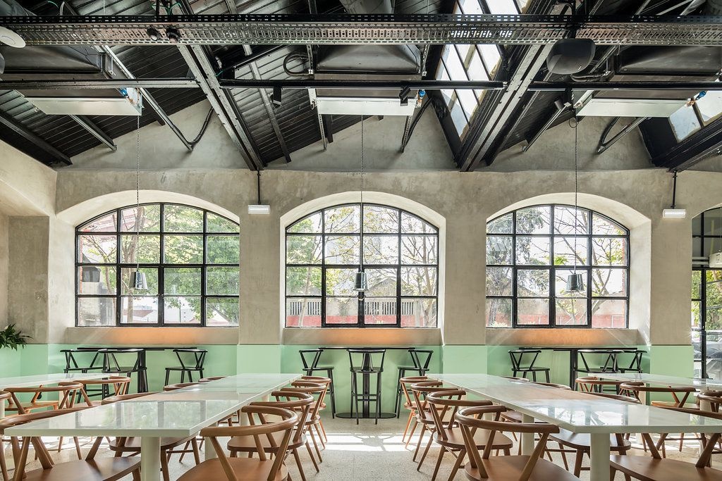 Довольно большое пространство фабричного цеха (его площадь составляет 230 кв м) Дуарте разделил на три зоны с помощью металлических решеток-перегородок. Бетонные стены дизайнер решил оставить, покрасив их снизу в модный мятный цвет и украсив неоновыми курицами в духе ночных клубов 1990-х и росписями в стиле футуристичных картин Хосе Собрал-де-Альмады Негрейроса.