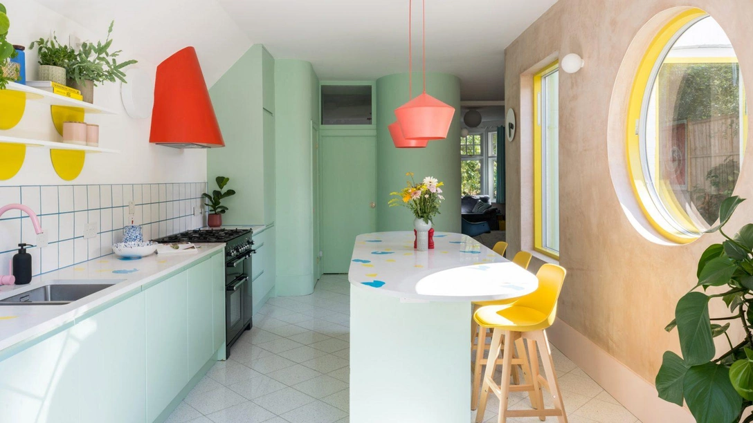На кухне дополнительные всплески цвета создают терракотовые подвесные светильники над обеденным столом и ярко-красная вытяжка, контрастирующие с розовыми и мятными стенами. Столешница и внешняя часть опор кухонного стола изготовлена из материала, напоминающего терраццо, но на самом деле произведенного из переработанных пластиковых столовых приборов.
