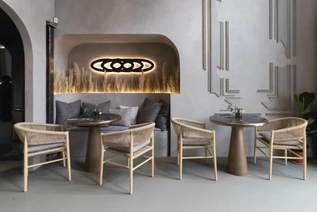 Визуальными референсами были интерьеры отелей Средиземноморского побережья: природные материалы, сухоцветы, атмосфера и стилем, а также бутики Aesop. Захотелось создать впечатление, что это заброшенный храм, который облагородили и открыли там кофейню.