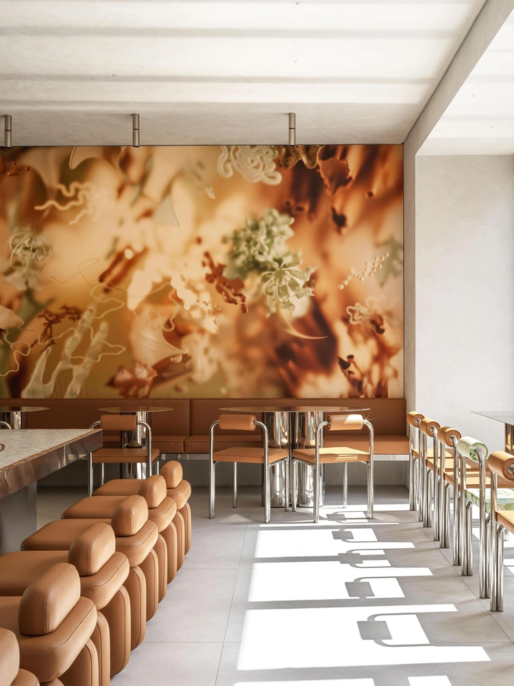 «Центральный объект — большой общий стол со столешницей, выложенной мраморной мозаикой с логотипом бренда, референcом для которой стала римская мозаика. Он привносит в интерьер дух истории и при этом не только функционален, но и представляет собой настоящее произведение искусства, контрастируя своей „крафтовостью“ с окружающим минималистским пространством и огромным экраном „лайтбокс“ с современной графикой от Facultative Works».