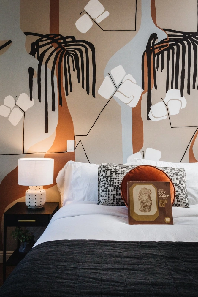 Чтобы сделать гостиничные номера похожими на уютные апартаменты, дизайнеры обустроили небольшие лаундж-зоны с бархатной мягкой мебелью, повесили книжные и журнальные полки и поставили винтажные музыкальные проигрыватели. Каждый сезон Дейв делает новую подборку виниловых пластинок для гостей и оставляет их на кроватях. В коллекцию искусства, служащую украшением белоснежных стен отеля, входят и картины музыкантов, например, рок-исполнителя A. Savage.