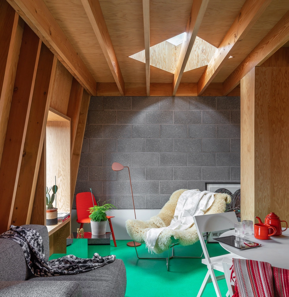 Все комнаты выдержаны в смелых цветах. Полы выполнены из пигментированного бетона ярко-зеленых и красных оттенков. Стены покрыты белой краской, через которую можно рассмотреть оригинальную кирпичную кладку. Кухни и кровати изготовлены из пихты Дугласа, а стены в ванных комнатах облицованы геометрической плиткой.