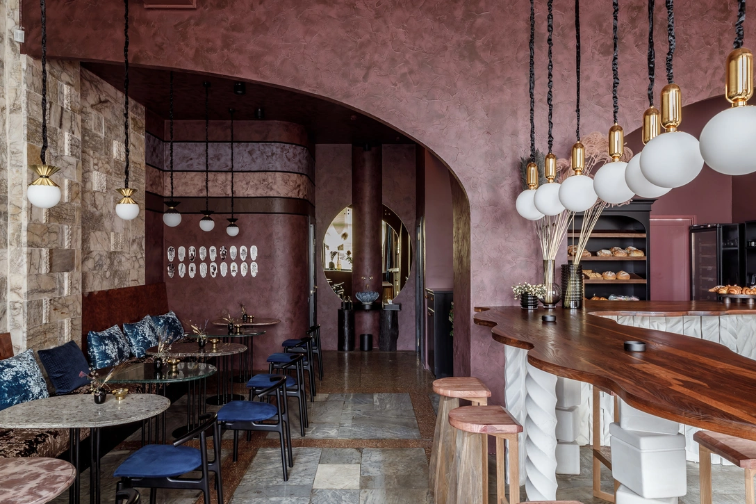 «В „Хлеб да Винчи’К“ все завязано на творчестве. Тарелка — это холст, еда — искусство, хлеб — только ручной работы со сложными сочетаниями. Мне хотелось использовать больше натуральных цветов. Так появились стулья трех оттенков дерева, столешница — это ясень, а спинка дивана — шпон корня амфоры. Бархат на седушках и подушках играет со светом и сложным советским мрамором на полу, который мы решили оставить, отшлифовав и сохранив его уникальную суть. Мрамор разных оттенков присутствует и на столах».