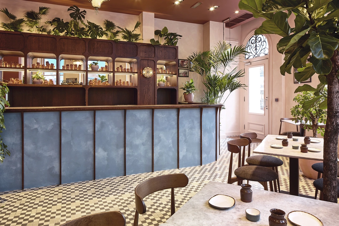 Цветовая гамма интерьера навеяна закатными пейзажами Калькутты. Желто-коричневые стены и терракотовые акценты сочетаются с текстурированным лазурно-голубым оттенком индийских вокзалов и одноименного поезда Darjeeling Express. Эта палитра также отражена в сервировке стола — от керамики ручной работы до столешниц, сделанных из полированного бетона. Он является одним из наиболее часто используемых материалов в Индии, наряду с необработанной латунью, из которой изготовлены светильники.