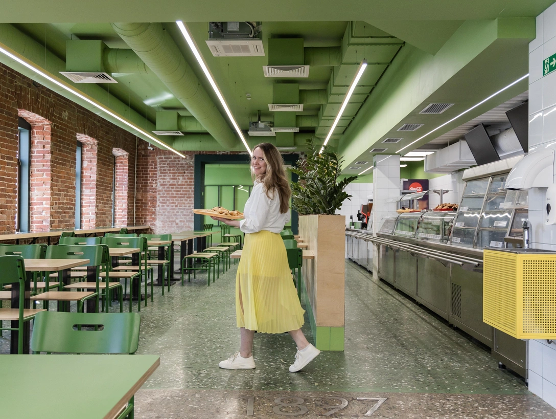 Столовая находится в историческом здании 1897 года постройки на центральной пешеходной улице Баумана в Казани. Было важно не только создать функциональный интерьер для большого потока посетителей, но и сделать отсылки к культурной идентичности Казани и истории дома Остермана.