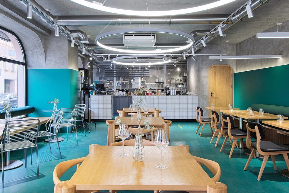 «Большие арочные окна и небольшая площадь помещения дали первоначальный толчок нашей концепции, — рассказывают дизайнеры — Мы решили сделать зал единым пространством, визуально объединив его с экстерьером улицы. Благодаря максимально эффективному зонированию удалось оптимально использовать общую площадь 116 кв. м и разместить на ней кухню, служебные помещения и зал с 50 посадочными местами».