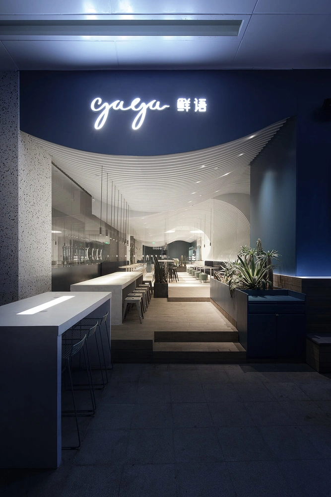 В нескольких торговых центрах в Китае есть искусственные пляжи. Например, в гигантском молле «Новый век» в городе Чэнду построен настоящий аквапарк площадью 5 тысяч кв. м. Создавая дизайн кафе-ресторана Gaga в первоклассном центре King Glory Mall, студия Coordination Asia хотела передать эту непринужденную и уютную атмосферу морского побережья.