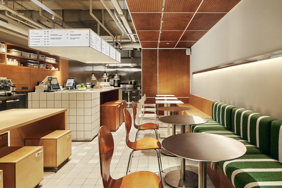 Под сидениями диванов можно заметить ручки с логотипом бренда — они открывают зону хранения под сидениями и предназначены для персонала. Напоминающие бирки на одежде они продолжают детали образа персонажа. Кроме того, цвет обивки повторяет основную палитру боулов, где ключевой ингредиент — зеленые овощи.