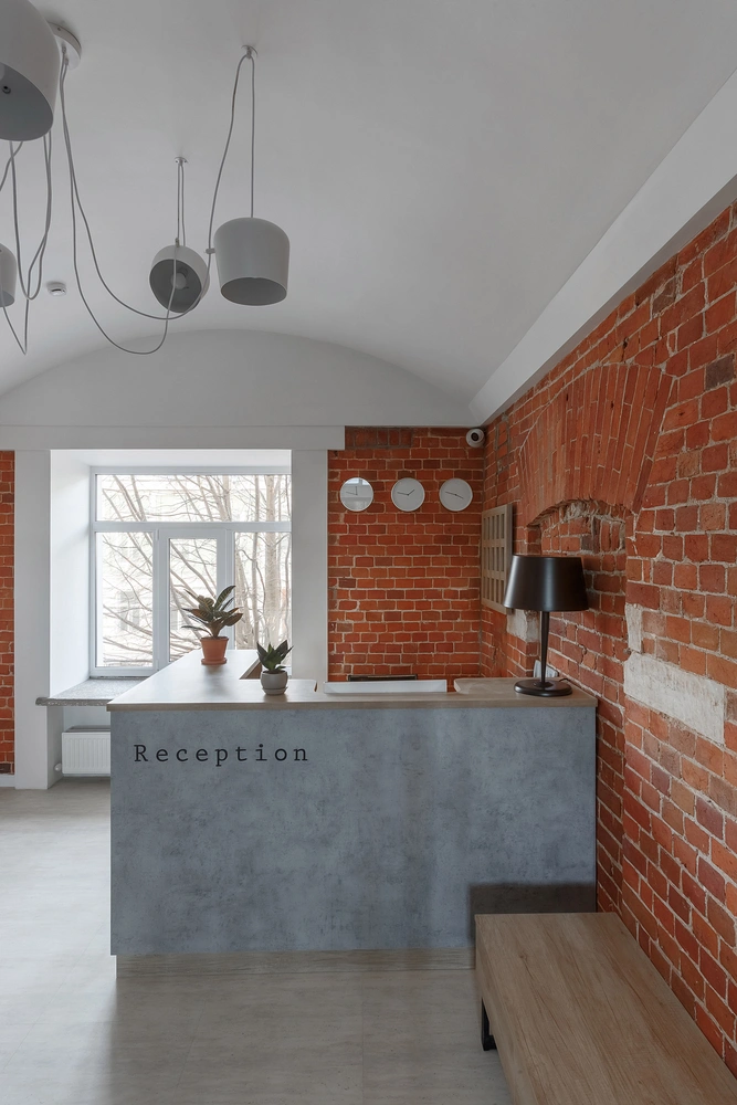 «Вся мебель, кроме стульев, выполнена на заказ. Особенную атмосферу создает старая кирпичная кладка и индивидуальный рисунок прямо на стенах — в каждом помещении он свой. Высота потолков здесь более четырех метров, для хостела это просто шикарное пространство. Некоторые металлические балки и конструктивные элементы мы тоже сохранили в интерьере».