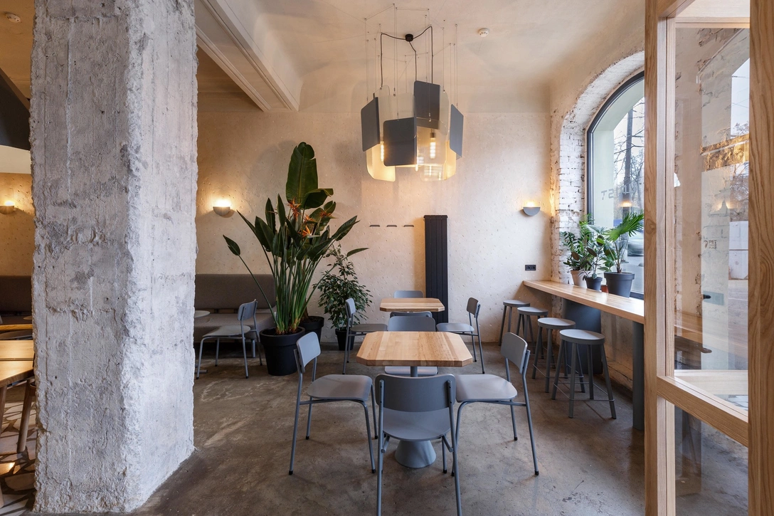 «Это заведение с особым настроением, — рассказывает Денис Соколов, один из основателей бюро. — Здесь интерьер не доминирует над гостями, а создает оптимальный сдержанный антураж для отдыха, общения и культурного досуга». Кофейня предусматривает посадку 36 человек в трех функциональных зонах — барной (у зоны обслуживания и у окна), у дивана и большого центрального комьюнити-стола, и все это на небольшой площади 70 м².