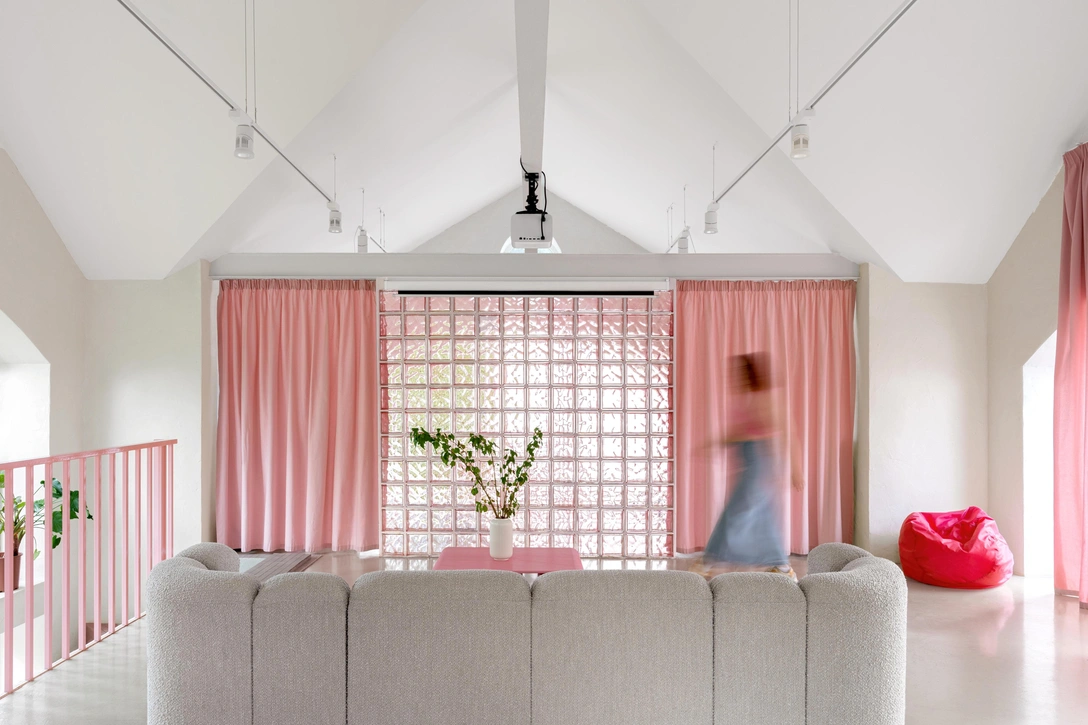 Второй этаж выполняет несколько функций: в обычные дни это коворкинг для посетителей кофейни, вечером здесь проходят кинопоказы, а по особым случаям — мероприятия и гаражные распродажи. Мы создали трансформируемое пространство с легко переставляемой мебелью, включая столы-трансформеры и модульные диваны. В центре помещения расположена перегородка из розовых стеклоблоков, отделяющая основную зону от технической.