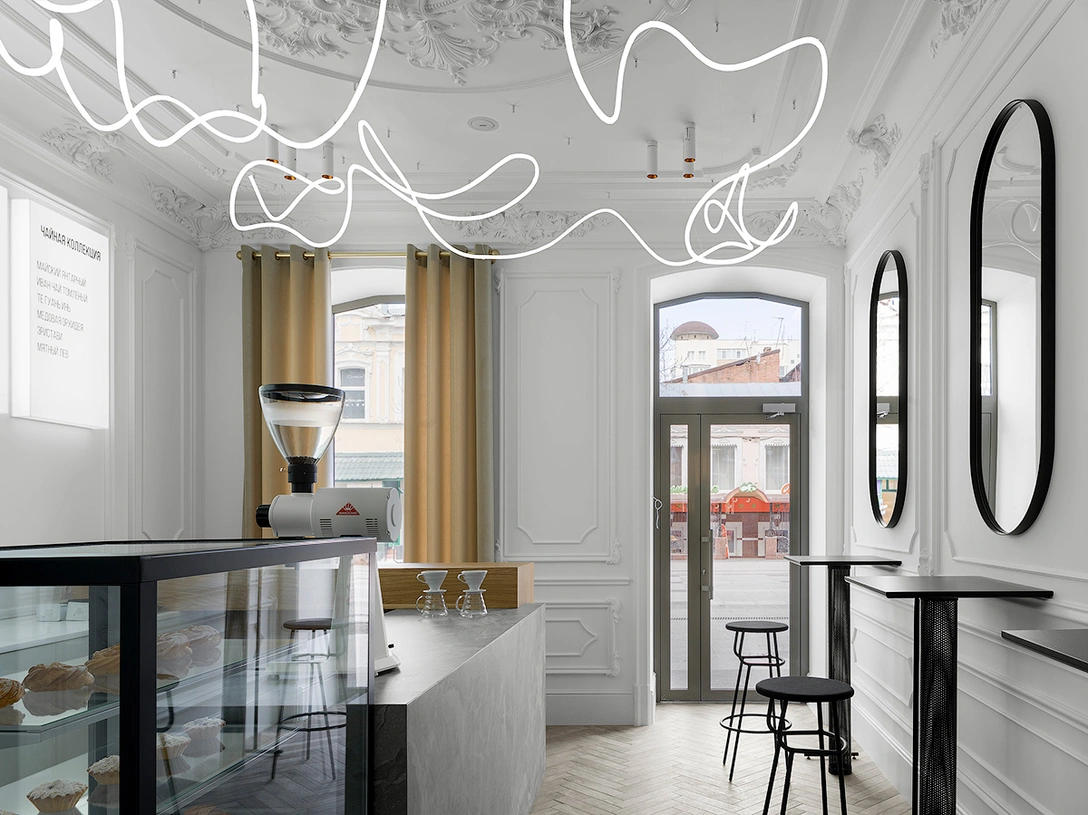 Кафе White Coffee находится на самой оживленной пешеходной улице Саратова и занимает первый этаж бывшего доходного дома, построенного в конце XIX века. Дизайн заведения, созданный студией Quadrum, вдохновлен классическими парижскими квартирами, в которых исторические детали гармонично сочетаются с современной мебелью и декором.