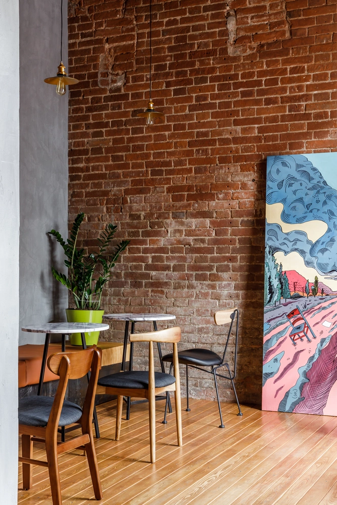 Кофейня заняла историческое здание начала прошлого века, поэтому одной из главных задач для дизайнеров стало сохранение архитектурной ценности помещения. «Чтобы подчеркнуть культурную значимость дома, некоторые стены были зачищены до исходной кирпичной кладки 1930-го года», — поясняют в студии.