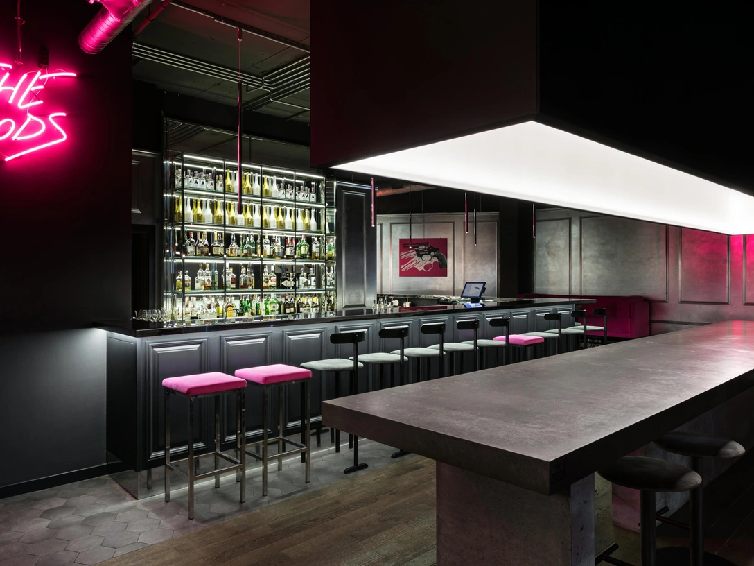 Блики света отражаются в длинной барной стойке, в витринах из нержавеющей стали и зеркалах с фацетами. Все изделия: корпусная, мягкая мебель и значительная часть освещения — выполнены на заказ по чертежам студии. Яркие акценты, игра света на поверхностях, розовый неон и крафтовые коктейли помогли создать андеграундную атмосферу богемной ночной жизни — все как в Ньй-Йорке 1960-х.