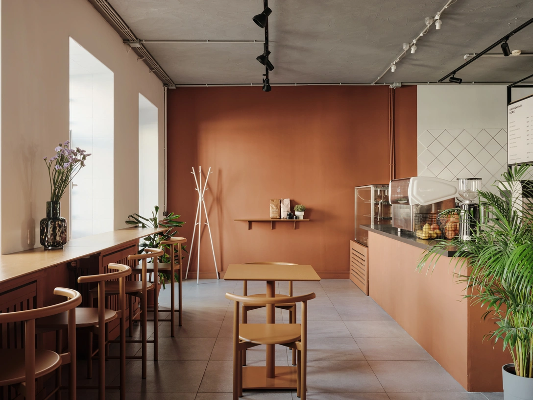 «Ограниченный бюджет определил большинство проектных решений и сделал цвет главным приемом, задающим настроение всему интерьеру, — рассказывает дизайнер Екатерина Ростова. — Терракотовый был выбран практически сразу: теплый и насыщенный, он фактически заменяет солнечный свет, который редко проникает в помещение — кофейня находится в темном дворе».