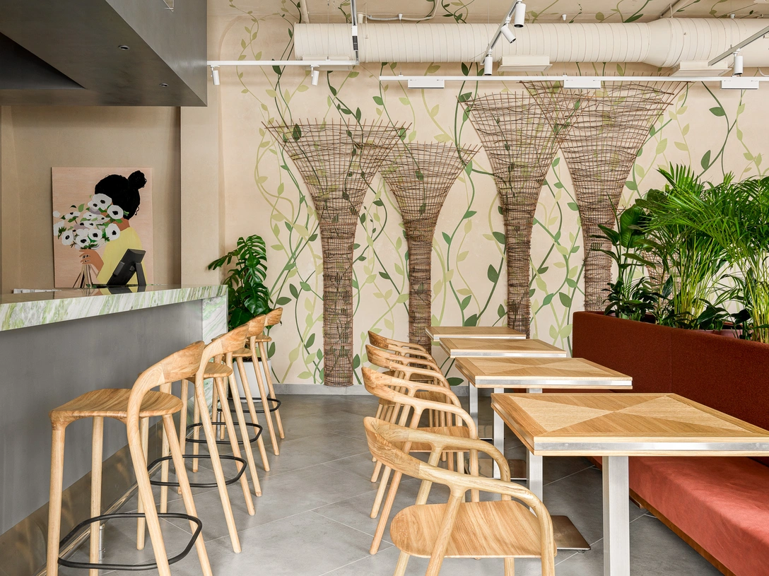 «Кафе занимает довольно компактное помещение (всего 85 кв.м), при этом немалая его часть представляет собой узкий коридор. Нашей главной задачей было грамотно спланировать пространство и сделать его максимально функциональным и удобным как для гостей, так и для команды. Мы предусмотрели разные варианты рассадки: есть отдельные столики на две, три и четыре персоны. Столы у диванов можно сдвинуть, чтобы с комфортном могла разместиться большая компания».